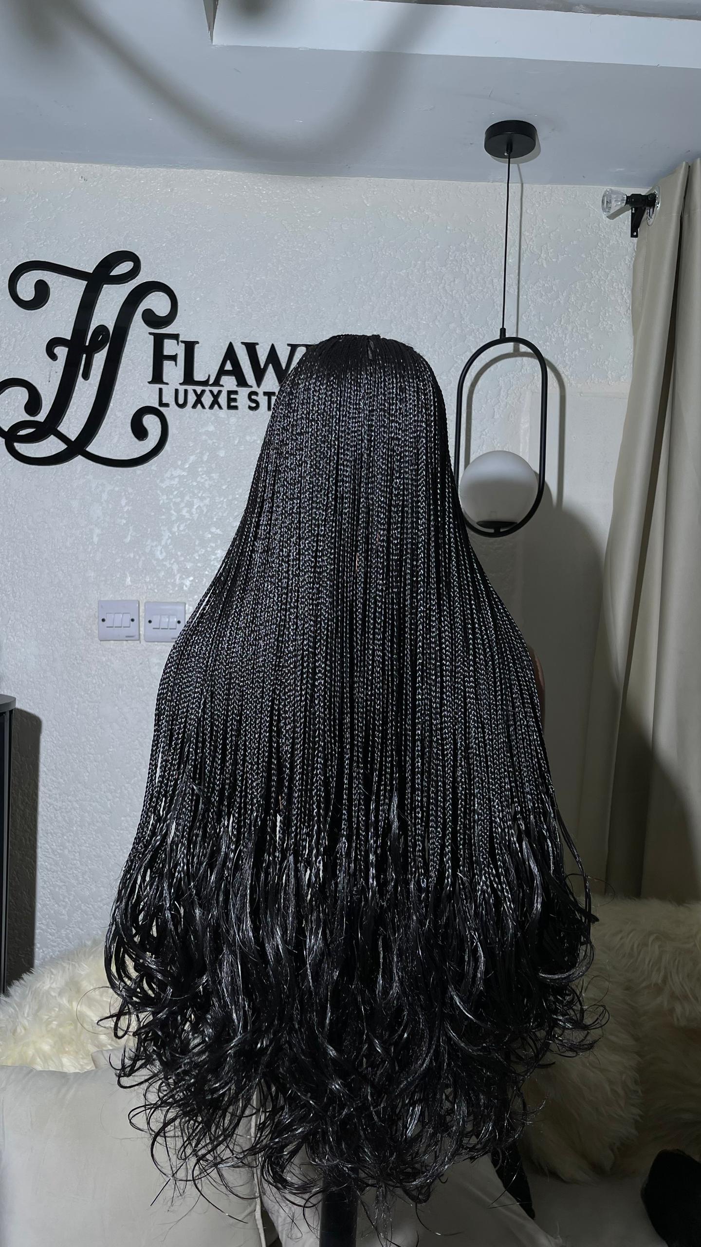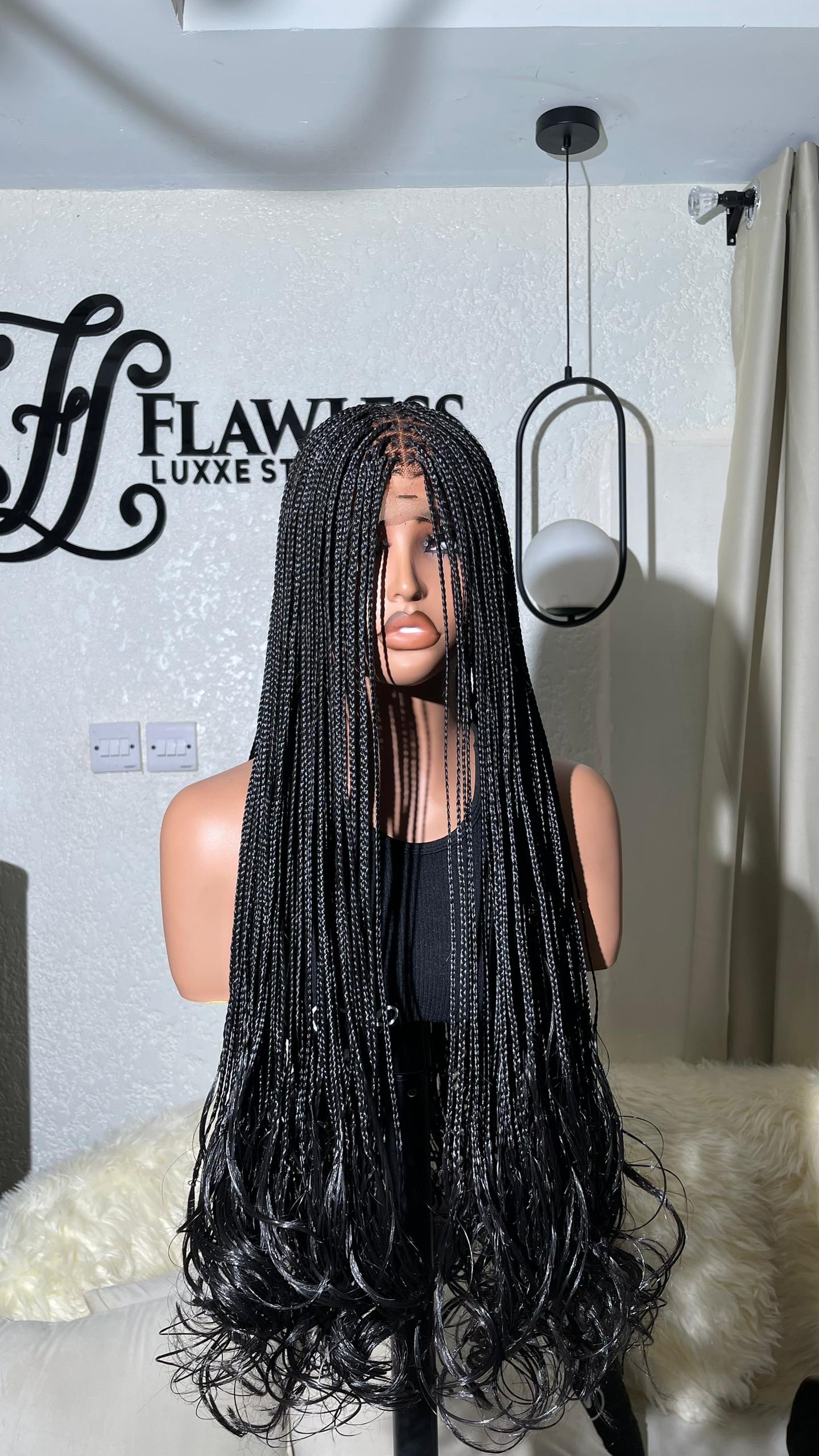✅ Length: 24” ✅ Weight: 550g (Full & Voluminous) ✅ Color: Classic Black ✅ Closure: 5×5 Human Hair Closure (natural-looking parting) ✅ Style: Knotless Braids with French Curls Perfect for everyday wear or special occasions, this wig offers a lightweight, protective style that’s easy to install and long-lasting.